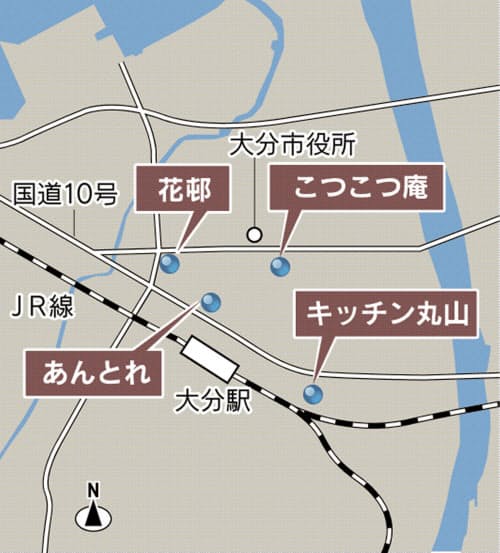 ビールや焼酎を片手にとり天を味わいたいという向きに人気なのは、関アジをはじめ大分料理がそろう「こつこつ庵(あん)」。消費税が上がっても650円で定食を提供する営業努力をする。松本宗三社長は「50年前の味と変わらない味を守り続けている」と胸を張る。出張ビジネス客の利用が多い割烹(かっぽう)「花邨(むら)」も下味に秘伝のたれを用いた優しい味が人気だ。