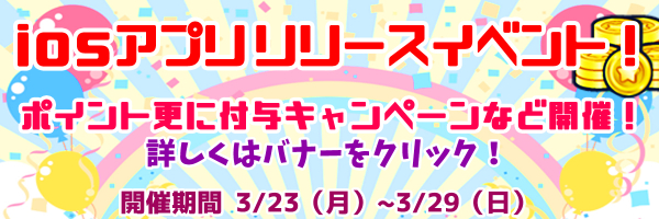 キャンペーン期間中、App Store, GooglePlayにて初めてポイントチャージ購入した方を対象に割り増し分をYPで付与します。通常購入よりもかなりお得にポイントをチャージできる機会を是非ご活用ください。