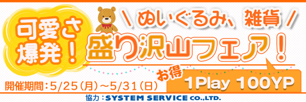 当フェアは、システムサービス株式会社様協力の元、可愛いぬいぐるみや雑貨などの一押し景品を1プレイ100YPで提供させて頂くことにより、ご遊戯への敷居を低くし、クレーンゲームの楽しさ、獲る事の喜びを初心者の皆様方へ提供したいという意見が両者合致した為、実現致しました。これまでオンラインクレーンゲームで遊ばれた事が無かった方だけではなく、クレーンゲーム自体あまり遊んだことがない皆様方にも是非ご参加頂ければと考えております。