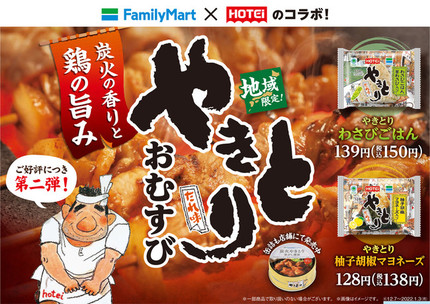 ファミリーマートは、ホテイフーズコーポレーション(以下、ホテイフーズ)の国産鶏肉を炭火で仕上げた「やきとり」を使用した共同開発の“おむすび”「やきとり 柚子胡椒マヨネーズ」、「やきとり わさびごはん」を12月7日から、東海地方(静岡県・愛知県・岐阜県・三重県・和歌山県一部)、甲信地方(山梨県・長野県)、北陸地方(富山県・石川県・福井県)のファミリーマート約3700店で発売する。